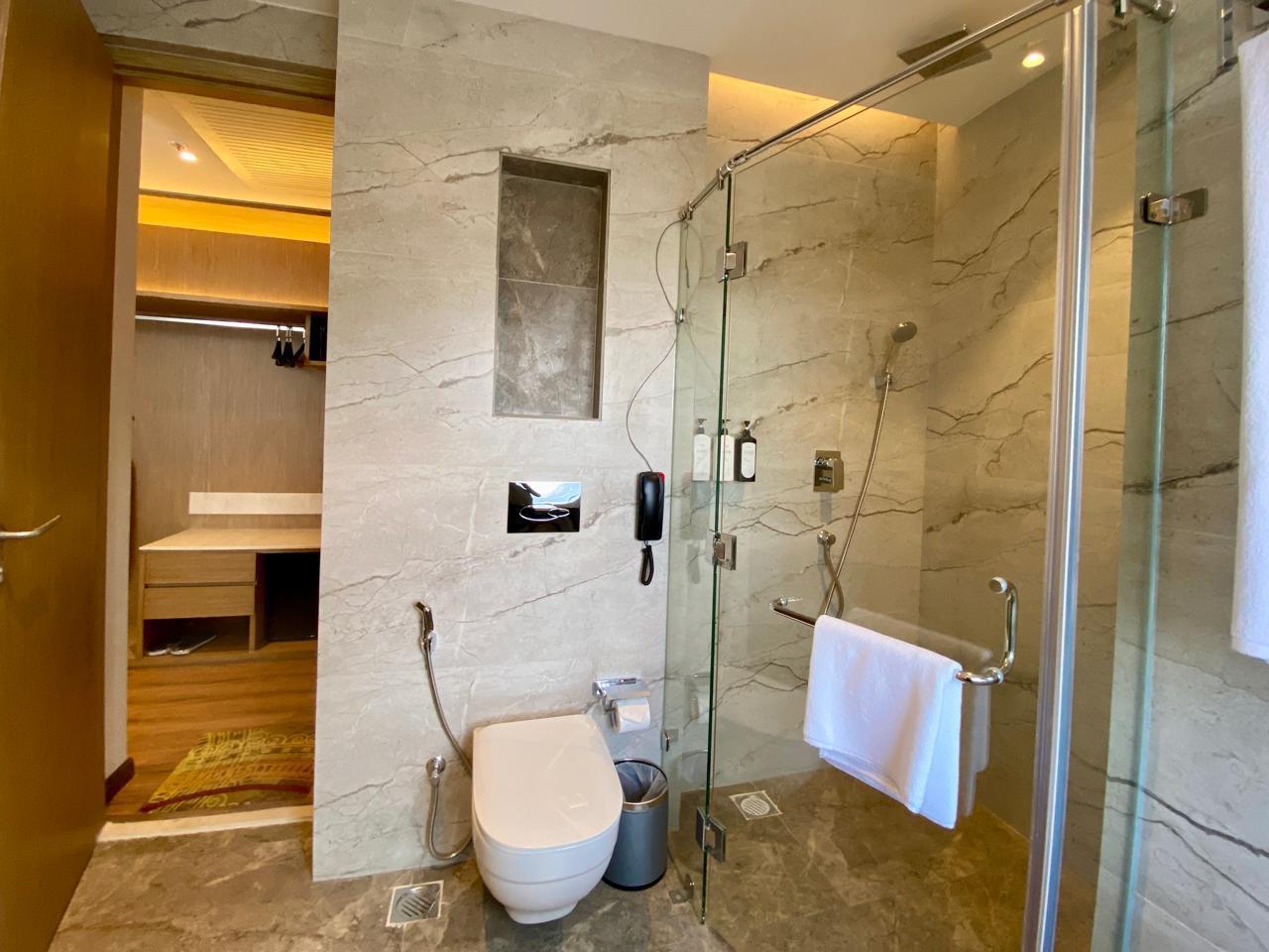 Inside, you’ll find premium furnishings, elegant décor, and soft ambient lighting that sets a relaxing atmosphere. The suite includes high-speed WiFi, climate control, flat-screen TV, mini-bar, in-room safe, and a workspace, making it ideal for both relaxation and business needs.